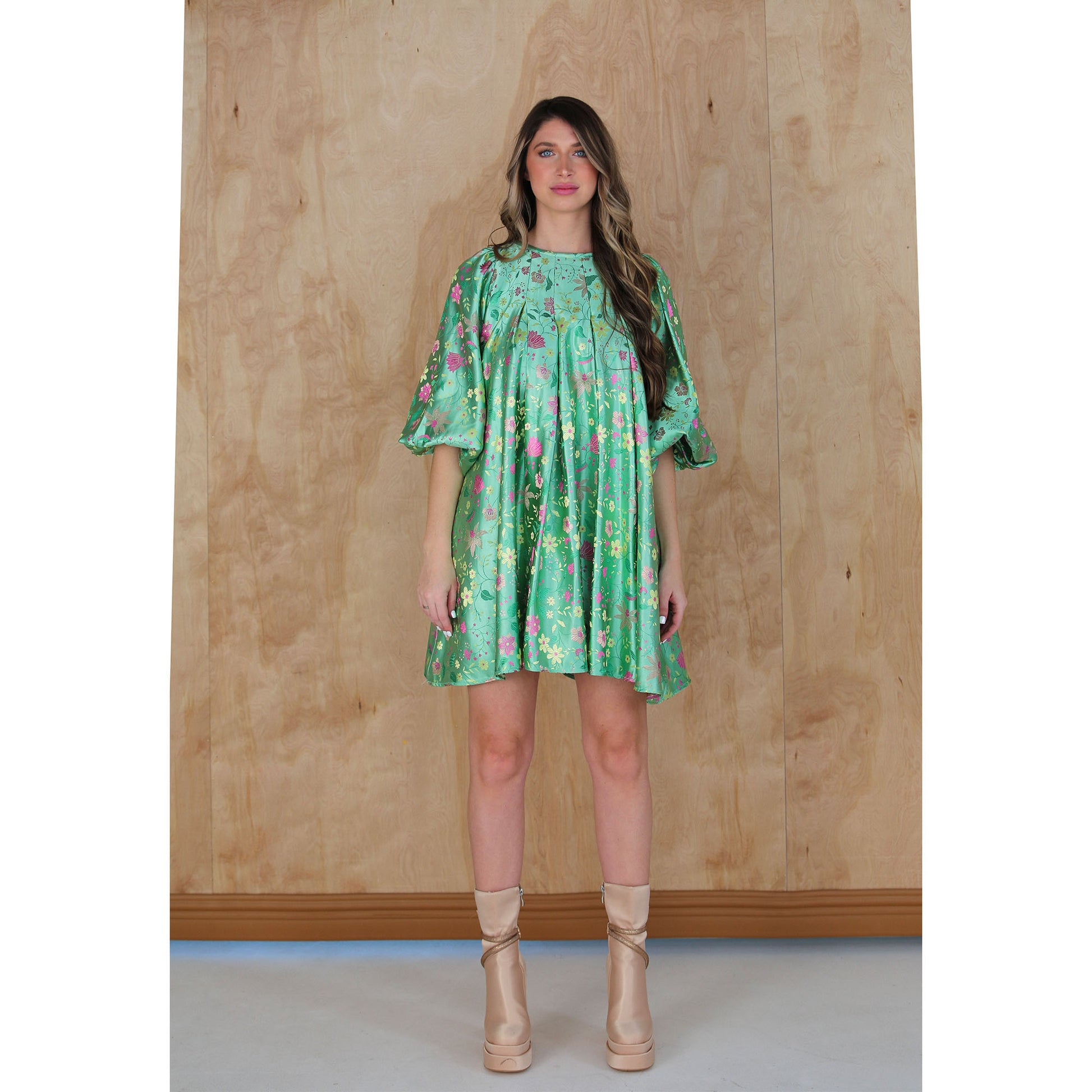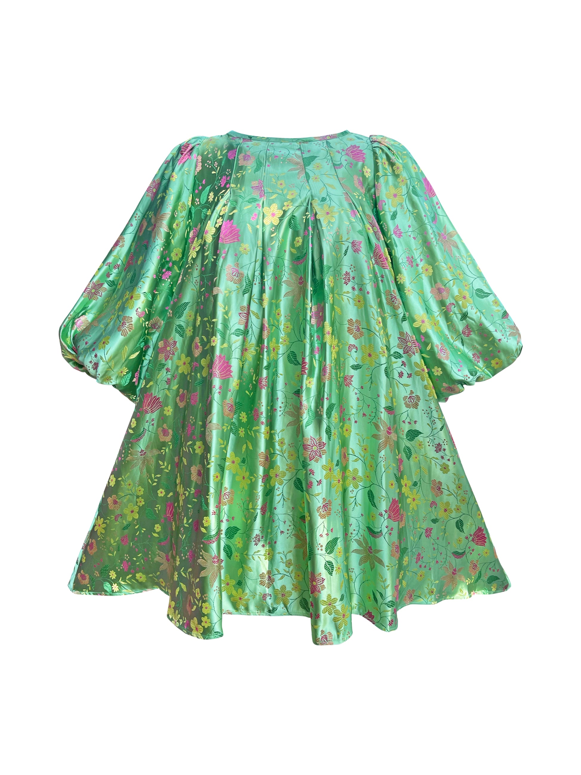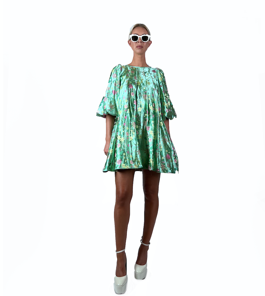 A mint floral satin puff dress.