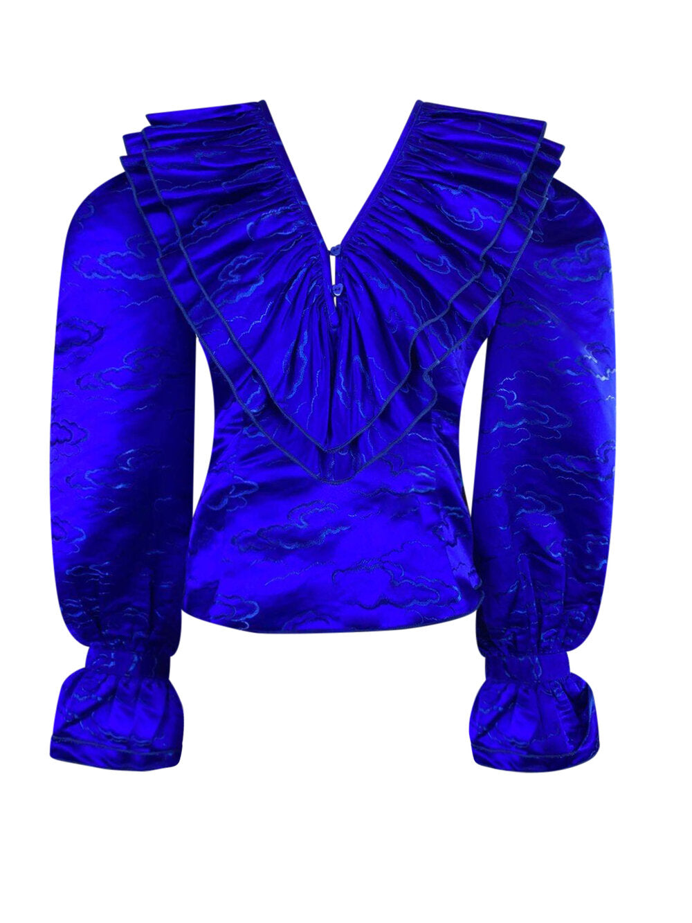 We only made a small batch of this top in our custom cloud silk jacquard. Our silk jacquard fabric is made on a very old delicate Chinese wedding fabric weaver.