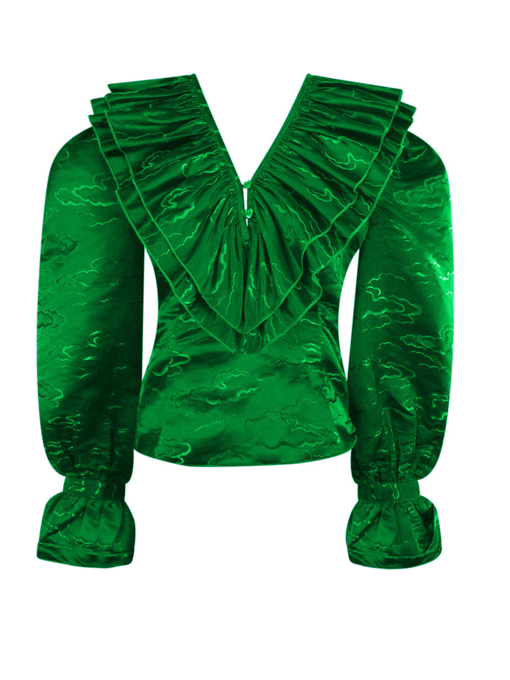 We only made a small batch of this top in our custom cloud silk jacquard. Our silk jacquard fabric is made on a very old delicate Chinese wedding fabric weaver.