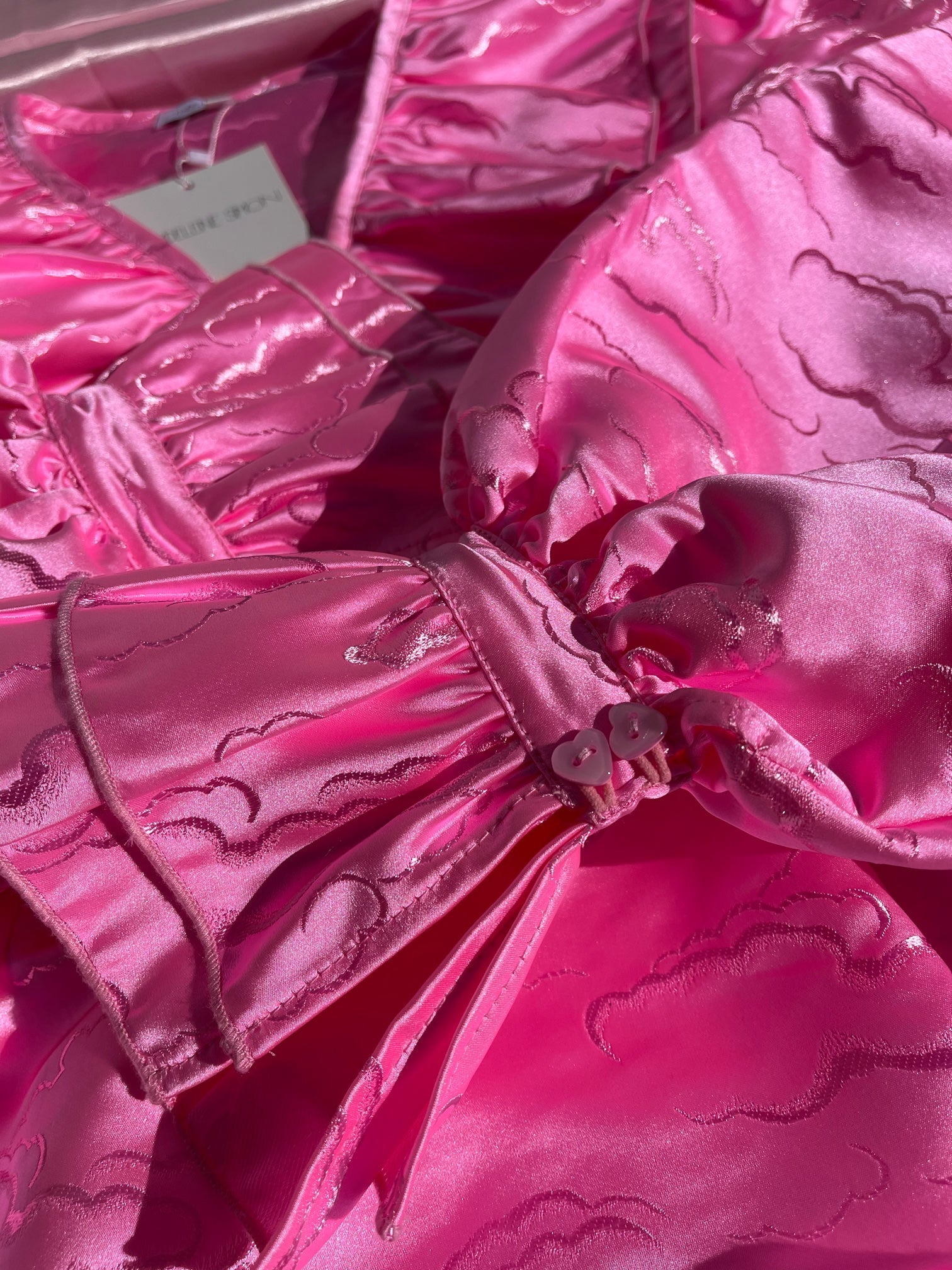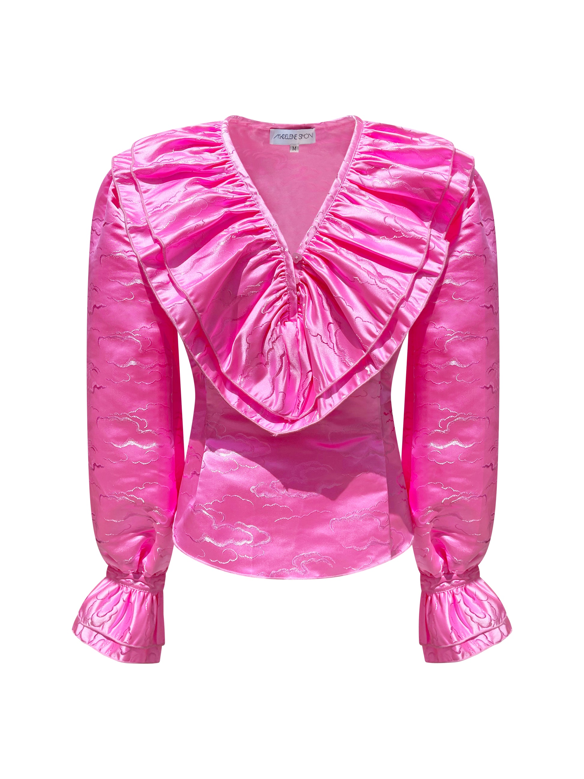 We only made a small batch of this top in our custom cloud silk jacquard. Our silk jacquard fabric is made on a very old delicate Chinese wedding fabric weaver.