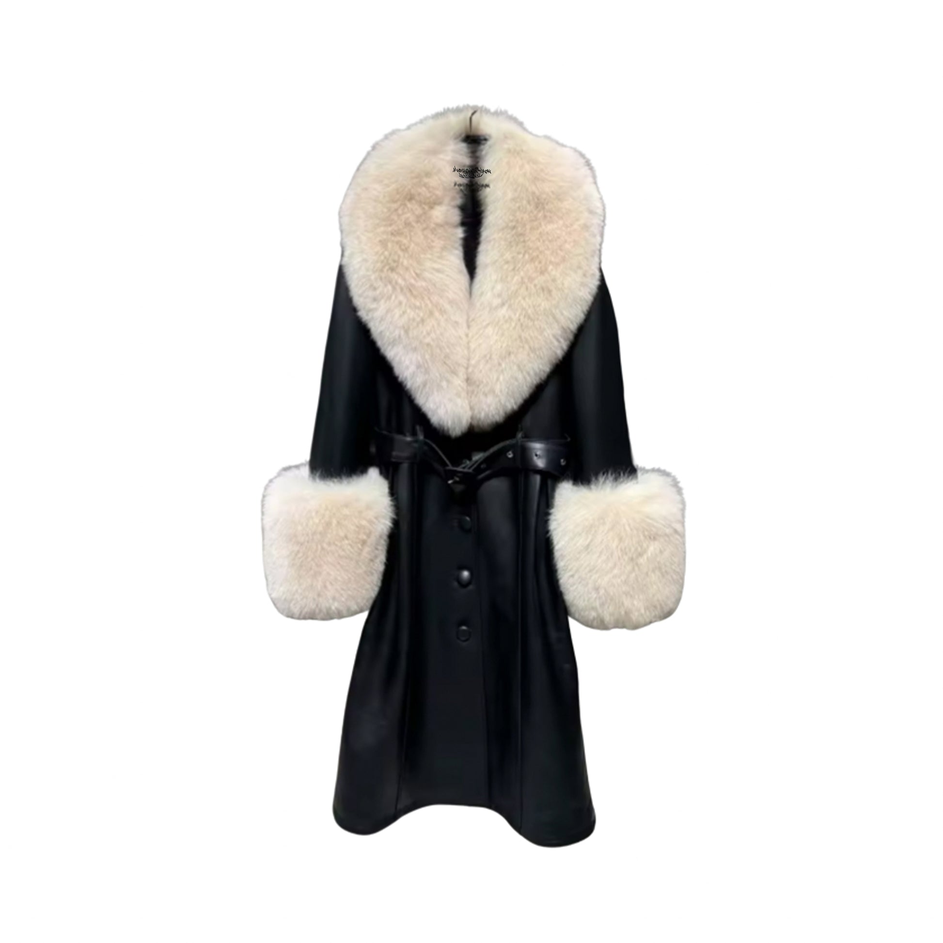 The Oreo coat is crafted from luxurious sheepskin. The contrasting white fur poufs create a bold, timeless design, while the sustainably sourced extra plush fur lining adds warmth and elegance.